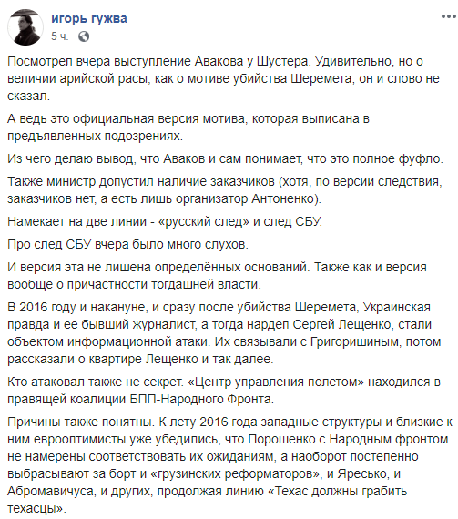 Тем временем, нардеп от "Оппозиционной платформы" Илья Кива (который был советником Авакова) сегодня заявил о том, что трое задержанных по делу Шеремета были агентами СБУ.