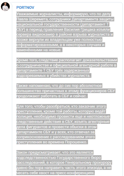 "Уважаемые журналисты, информирую, что по делу Павла Шеремета, сотрудники Департамента защиты национальной государственности (департамент Т СБУ) в период правления Василия Грицака изъяли сервера видеокамер в районе взрыва журналиста и позже вернули их владельцам уже полностью отформатированными, а в некоторых случаях и заменёнными на новые.