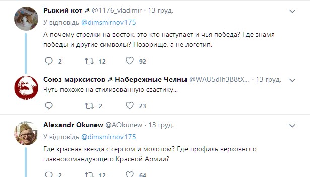 "Если уж и делать стрелки, то направление их должно быть в другую сторону, на Запад", "Чуть похоже на стилизованную свастику...", "Где красная звезда с серпом и молотом? Где профиль верховного главнокомандующего Красной Армии?", "Вопрос к Оргкомитету: вы, и*иоты, вообще помните, чьи войска в войну наступали "направо", на восток?", - пишут пользователи.