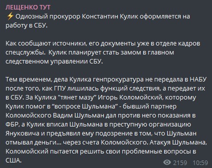 "Тем временем, дела Кулика генпрокуратура не передала в НАБУ после того, как ГПУ лишилась функций следствия, а передает их в СБУ. За Кулика "тянет мазу" Игорь Коломойский, которому Кулик помог в "вопросе Шульмана" - бывший партнер Коломойского Вадим Шульман дал против него показания в ФБР, а Кулик вписал Шульмана в преступную организацию Януковича и предъявил ему подозрение в том, что Шульман отмывал деньги… через счета Коломойского. Атакуя Шульмана, Коломойский пытается решить свои проблемные вопросы в США", - пишет Лещенко.