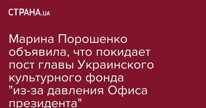 "Несколько дней назад от министра культуры молодежи и спорта Украины в Наблюдательный совет Украинского культурного фонда поступило "предложение" досрочно прекратить мои полномочия как главы Наблюдательного совета. Понятно, что этот шаг инициировано Офисом президента и о культуре в этой ситуации там явно не думали. Очевидно, что у нас разные взгляды на культуру вообще, и на политическую культуру в частности", - сообщила Порошенко в своем видеообращении, опубликованном на сайте партии "Европейская солидарность" в понедельник.