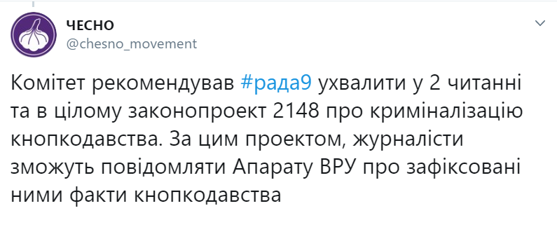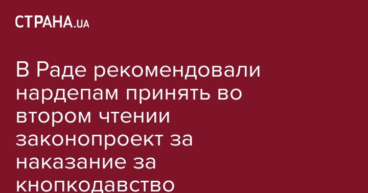 Комитет рекомендовал парламенту Украины принять во втором чтении и в целом законопроект 2148 о криминализации кнопкодавства. По его текущей редакции в случае принятия, журналисты смогут сообщать Аппарату парламента о зафиксированных ими фактах "кнопкодавства".