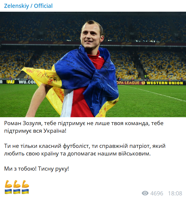 "Роман Зозуля, тебя поддерживает не только твоя команда, тебя поддерживает вся Украина! Ты не только классный футболист, ты настоящий патриот, который любит свою страну и помогает нашим военным. Мы с тобой! Жму руку!", - говорится в опубликованном сообщении.