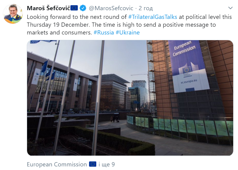 "С нетерпением ожидаем следующего раунда трехсторонних переговоров по газу на политическом уровне в этот четверг, 19 декабря. Пришло время послать положительный мессидж (сигнал - Ред.) рынкам и потребителям", - говорится в опубликованном сообщении.