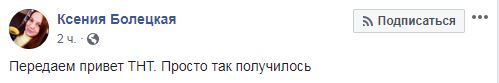 "Передаем привет ТНТ. Просто так получилось", - также написала в Facebook редактор "Ведомостей" Ксения Болецкая.