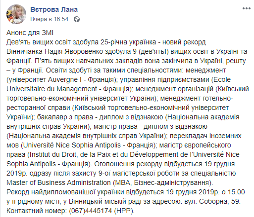 Восемь высших образований в свои 25 лет успела получить украинка Надежда Яворовенко из Винницы. Но и это не предел, поскольку вскоре она получит девятый диплом. Об этом сообщила на своей странице в соцсети глава Национального реестра рекордов Ланы Ветровой, анонсируя установление нового рекорда, который будет зафиксирован 19 декабря, сразу после получения студенткой очередного диплома о высшем образовании.
