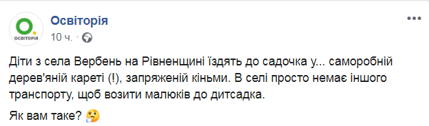 "Дети из села Вербень на Ровенщине ездят в садик в... самодельной деревянной карете (!), запряженной лошадьми. В селе просто нет другого транспорта, чтобы возить детей в детсад. Как вам такое?" - сказано в записи.