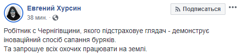 "Работник с Черниговщины, которого подстраховывает зритель - демонстрирует инновационный способ прополки свеклы. И приглашает всех желающих работать на земле" - написал Евгений Хурсин.