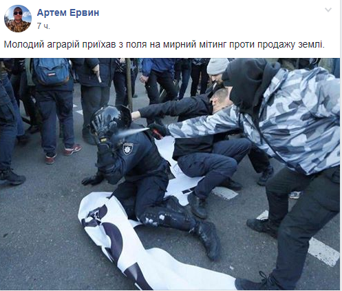 "Молодой аграрий приехал с поля на мирный митинг против продажи земли" - пишет Артем Ервин.