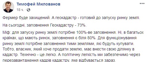 Министр развития экономики, торговли и сельского хозяйства Тимофей Милованов заявил, что земельный кадастр готов к открытию ранка земель сельскохозяйственного назначения, несмотря на то, что его наполненность не составляет 100%. Об этом он сообщил у себя в Facebook.