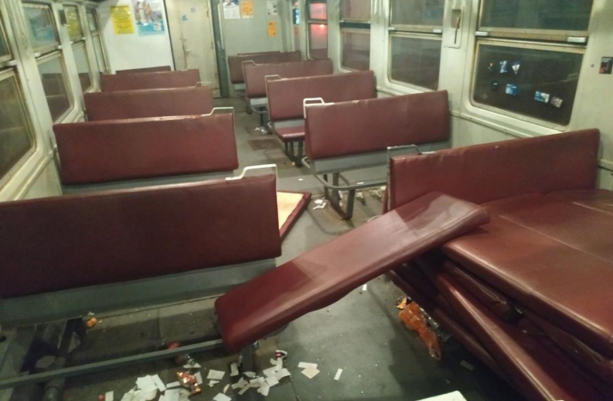 Уточним, что инцидент произошел 15 декабря. Хулиганы сорвали 35 сидений, стоп-кран, а также подожгли петарды и файеры.