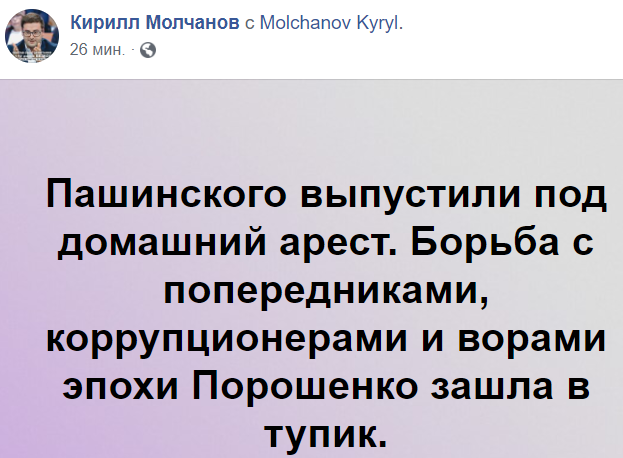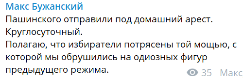 "Пашинского отпустили под круглосуточный домашний арест. На этом "эра посадок" благополучно закончилась. Зеленский именно с этого момента превратился в "порохоботскую тыкву". Ожидаемо, че. Обменяли ли Пашинского на некие показания против других товарищей? Вообще не имеет значения. Даже если это так, то ни к каким последствиям подобные знания не приведу. Короче, Зеленский усиленно ищет своих новых избирателей среди 23 процентов Петра Порошенко. И, судя по всему, крайне успешно", - пишет журналист Александр Зубченко.