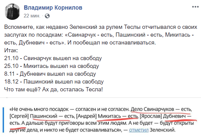 "Вспомните, как недавно Зеленский за рулем Теслы отчитывался о своих заслугах по посадкам: "Свинарчук - есть, Пашинский - есть, Микитась - есть, Дубневич - есть". И пообещал не останавливаться.
