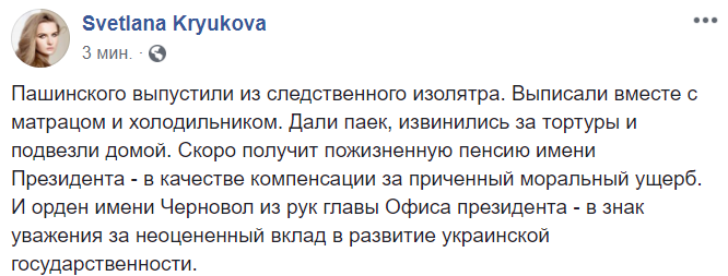 "Пашинского выпустили из следственного изолятра. Выписали вместе с матрацом и холодильником. Дали паек, извинились за тортуры и подвезли домой. Скоро получит пожизненную пенсию имени Президента - в качестве компенсации за приченный моральный ущерб. И орден имени Черновол из рук главы Офиса президента - в знак уважения за неоцененный вклад в развитие украинской государственности", - троллит замглавного редактора "Страны" Светлана Крюкова.