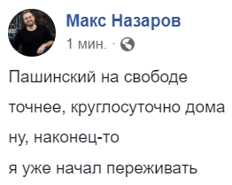 "Пашинский на свободе. Точнее, круглосуточно дома. Ну, наконец-то, я уже начал переживать", - пишет в столь же ироничном стиле журналист Макс Назаров.