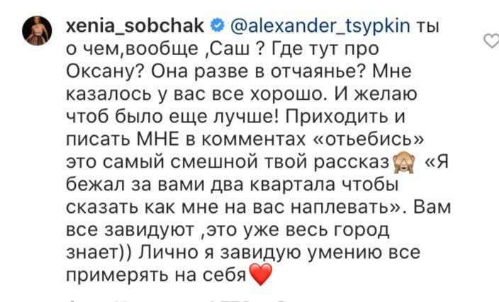 Собчак ответила Цыпкину так: "Это самый тво смешной рассказ. "Я бежал за вами два квартала, чтобы сказать, как мне на вас наплевать". И пожелала, чтобы у пары было все еще лучше.