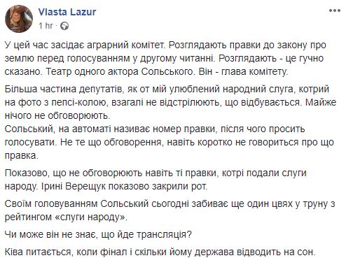 Своим председательством Сольский сегодня забивает еще один гвоздь в гроб рейтинга "Слуги народа". Может он не знает, что идет трансляция? Кива спрашивает, когда финал и сколько ему государство отводит на сон", - написала журналистка.