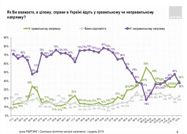 Как показал соцопрос, 40% опрошенных украинцев считают, что страна движется в правильном направлении, 38% – в неправильном, 22% – не смогли оценить. За последние 2 недели произошел рост положительных оценок (с 33 до 40%) и уменьшение негативных (с 48 до 38%).