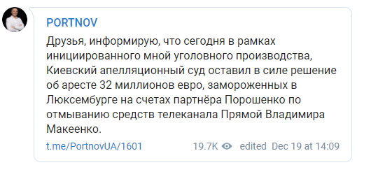 "Друзья, информирую, что сегодня в рамках инициированного мной уголовного производства, Киевский апелляционный суд оставил в силе решение об аресте 32 миллионов евро, замороженных в Люксембурге на счетах партнера Порошенко по отмыванию средств телеканала Прямой Владимира Макеенко", - говорится в сообщении.
