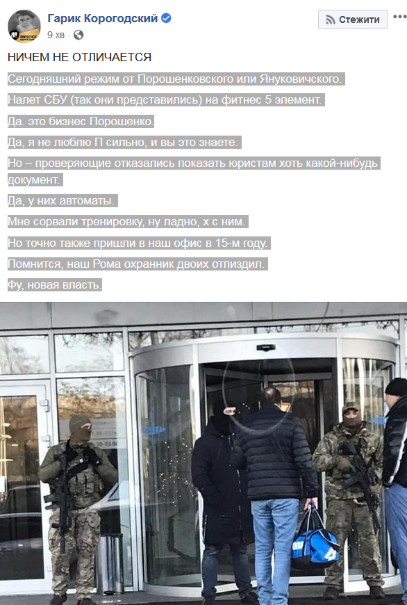 "Налет СБУ (так они представились) на фитнес 5 элемент. Да, это бизнес Порошенко. Да, я не люблю П. сильно, и вы это знаете. Но - проверяющие отказались показать юристам хоть какой-нибудь документ. Да, у них автоматы. Мне сорвали тренировку, ну ладно, х... с ним. Но точно также пришли в наш офис в 15-м году. Помнится, наш Рома охранник двоих отп@здил", - написал Гарик Корогодский.