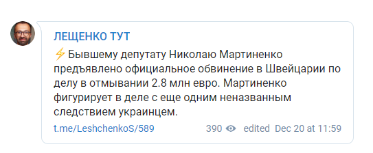 "Бывшему депутату Николаю Мартыненко предъявлено официальное обвинение в Швейцарии по делу в отмывании 2,8 млн евро. Мартиненко фигурирует в деле с еще одним неназванным следствием украинцем", - говорится в сообщении.