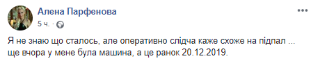 "Я не знаю что случилось, но оперативно-следственная говорит, похоже на поджог ... еще вчера у меня была машина, а это утро 20.12.2019", - говорится в сообщении.