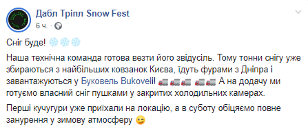 "Наша техническая команда везет снег отовсюду. Поэтому тонны снега уже собираются с самых больших катков Киева, едут фурами из Днепра и загружаются в Буковеле! В добавок мы готовим собственный снег пушками в закрытых холодильных камерах", — сообщили организаторы мероприятия.