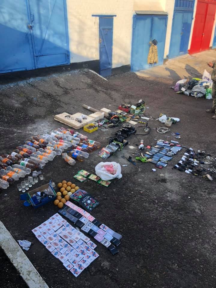 Сообщается, что в тайнике было более 100 литров водки, дрожжи и закваска для самогоноварения, наркотические средства и устройства для их употребления, 44 мобильных телефона и 30 зарядных устройств для них, ключи от камерных дверей.