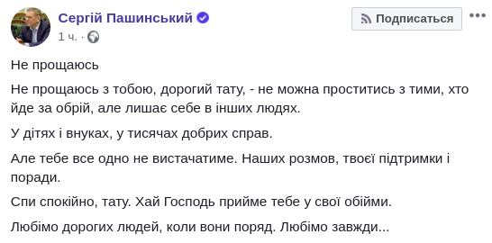 "Не прощаюсь с тобой, дорогой папа, - нельзя проститься с теми, кто идет за горизонт, но оставляет себя в других людях. В детях и внуках, в тысячах добрых дел. Но тебя все равно не хватает. Наших разговоров, твоей поддержки и советов. Спи спокойно, папа. Пусть Господь примет тебя в свои объятия" - написал Пашинский.