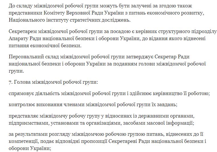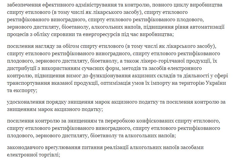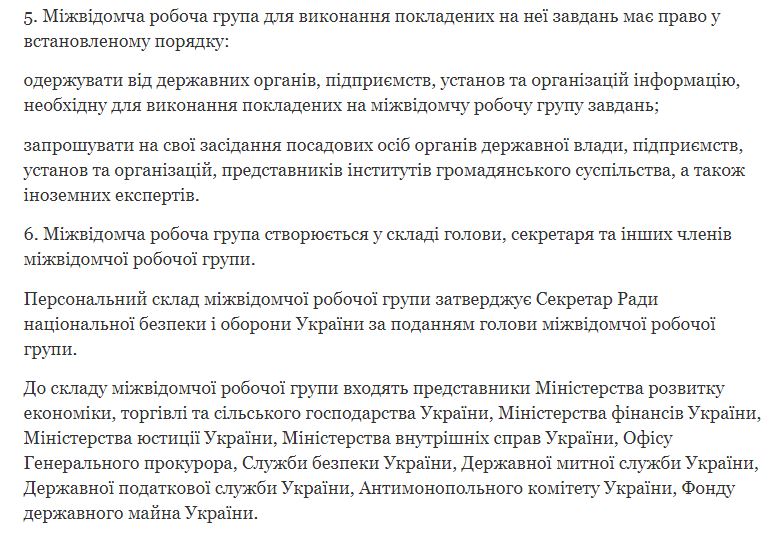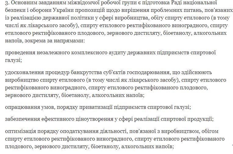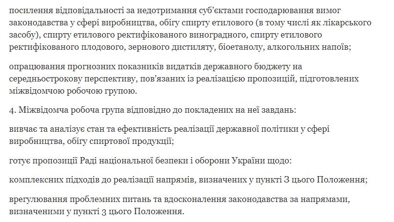 Согласно информации, основная задача рабочей группы заключается в подготовке Совету национальной безопасности и обороны Украины предложений по решению проблемных вопросов относительно реализации госполитики в области производства, оборота спирта и алкогольных напитков.
