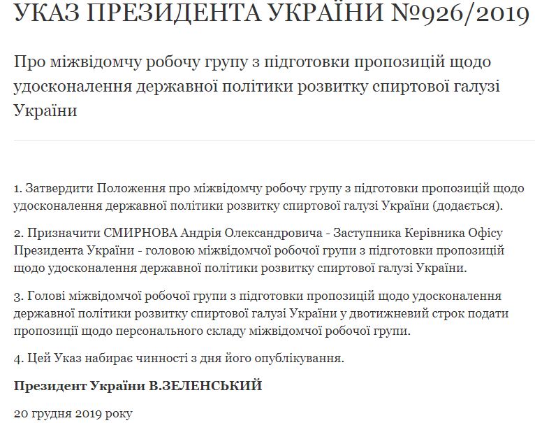 Заместителя главы Офиса президента Украины Андрея Смирнова назначили главным в межведомственную рабочую группу по подготовке вариантов совершенствования политики страны относительно развития спиртовой отрасли.