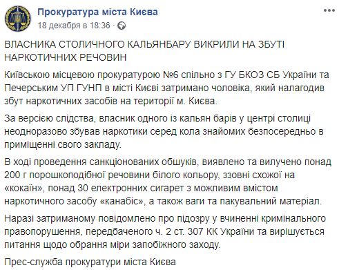 В среду, 18 декабря, в киевском кальян-баре задержали владельца, который сбывал наркотические вещества. Об этом сообщается на странице столичной прокуратуры в Facebook.