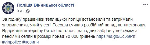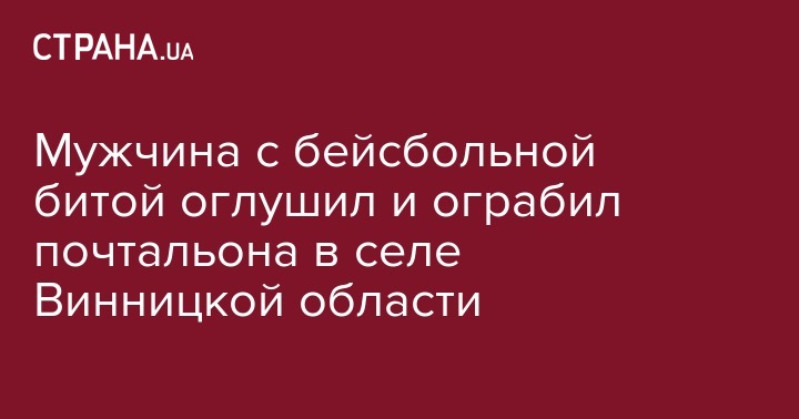 Сегодня, 21 декабря, в селе Росоша Винницкой области правоохранители поймали мужчину, который ударил битой почтальона по голове и отобрал у него деньги. Об этом сообщается на официальном сайте областной полиции и на ее странице в социальной сети Facebook.