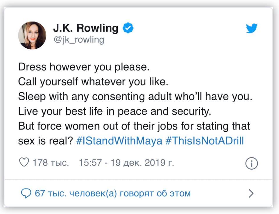 "Одевайтесь, как вам нравится. Называйте себя, как вам хочется. Спите с любым взрослым человеком при наличии его согласия. Получайте удовольствие от жизни и живите в мире и спокойствии. Но нужно ли лишать женщин их работы за утверждения о том, что половая принадлежность — это реальность".