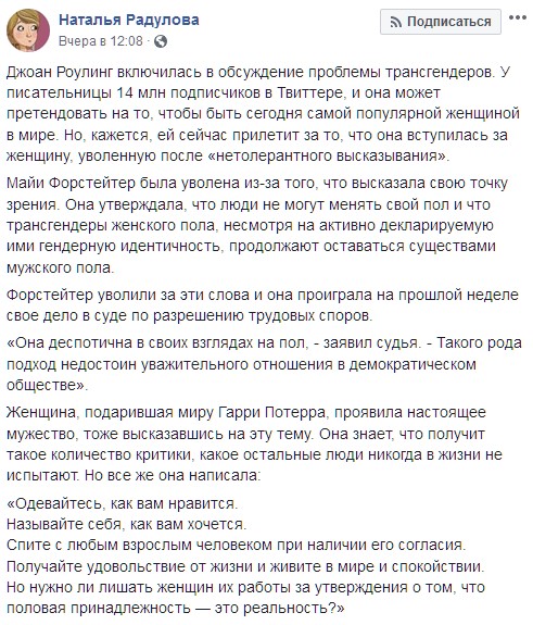 "Джоан Роулинг включилась в обсуждение проблемы трансгендеров. У писательницы 14 миллионов подписчиков в Твиттере, и она может претендовать на то, чтобы быть сегодня самой популярной женщиной в мире. Но, кажется, ей сейчас прилетит за то, что она вступилась за женщину, уволенную после "нетолерантного высказывания", - сказала она.