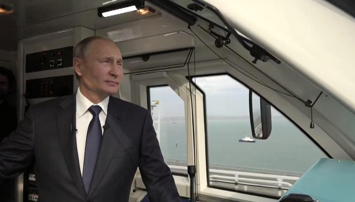 В пути российский президент зашел в кабину машиниста, где провел часть пути в компании министра транспорта Евгения Дитриха. Потом перешел в вагон, где ехали рабочие-мостовики, и кратко побеседовал с ними.