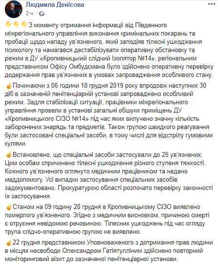 Бунт в Кропивницком СИЗО. Силовики применили спецсредства и скотч, двоих человек уволили - Денисова