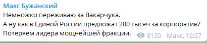 "Немножко переживаю за Вакарчука. А ну как в Единой России предложат 200 тысяч за корпоратив? Потеряем лидера мощнейшей фракции" - отреагировал нардеп от "Слуги народа" Макс Бужанский.