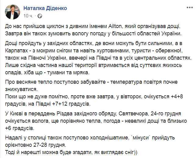 В Украину пришел циклон под названием Айлтон, из-за которого 24 декабря будет дождливо в большинстве областей. Об этом сообщает в Facebook синоптик Наталья Диденко.