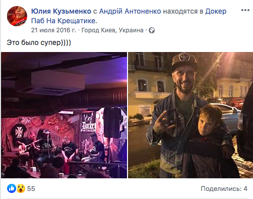 16:20 На следующий день после убийства Шеремета Юлия Кузьменко посещала концерт в одном из баров Киева и постила фото своего сына с Риффмастером - главным подозреваемым по делу.