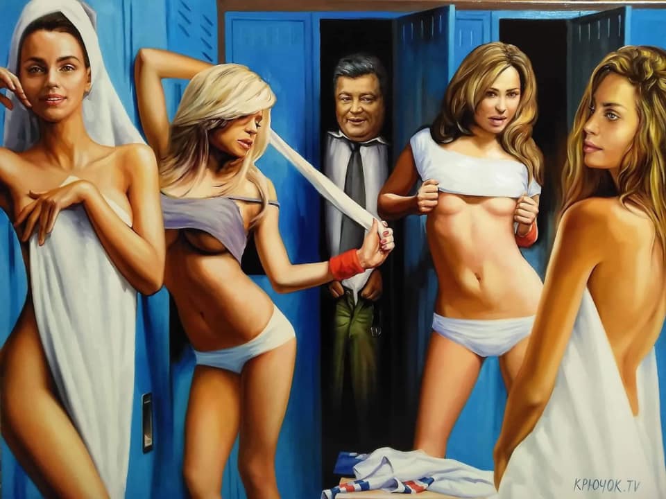 На картине автор изобразил находящихся в раздевалке полуобнаженных девушек. А в центре композиции он расположил мужчину, похожего на экс-президента Украины Петра Порошенко.