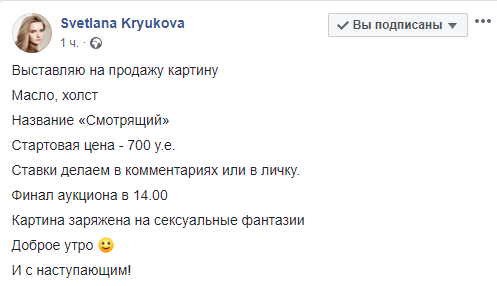 "Выставляю на продажу картину. Масло, холст. Название "Смотрящий". Стартовая цена - 700 у.е. Ставки делаем в комментариях или в личку. Финал аукциона в 14.00. Картина заряжена на сексуальные фантазии", - говорится в сообщении Светланы Крюковой.