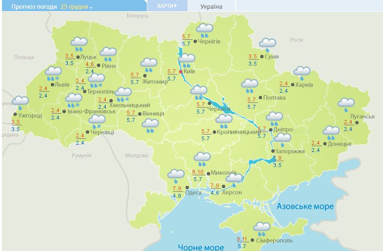 В Украине в среду, 25 декабря, когда католики отмечают Рождество Христово, ожидается дождливая, местами снежная погода, а ночью будут заморозки. Об этом сообщил сайт Укргидрометцентра.