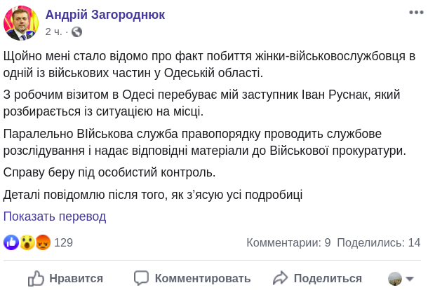 "Только что мне стало известно о факте избиения женщины-военнослужащего в одной из воинских частей в Одесской области. С рабочим визитом в Одессе находится мой заместитель Иван Руснак, который разбирается с ситуацией на месте", - написал чиновник.