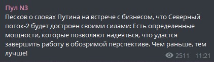 Также, как пишет Смирнов, пресс-секретарь Путина Дмитрий Песков на встрече с представителями бизнеса сказал, что Северный поток-2 будет достроен своими силами.