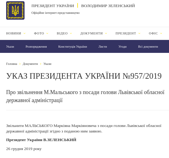 Соответствующие указы №956/2019 и №957/2019 появились на сайте главы государства.