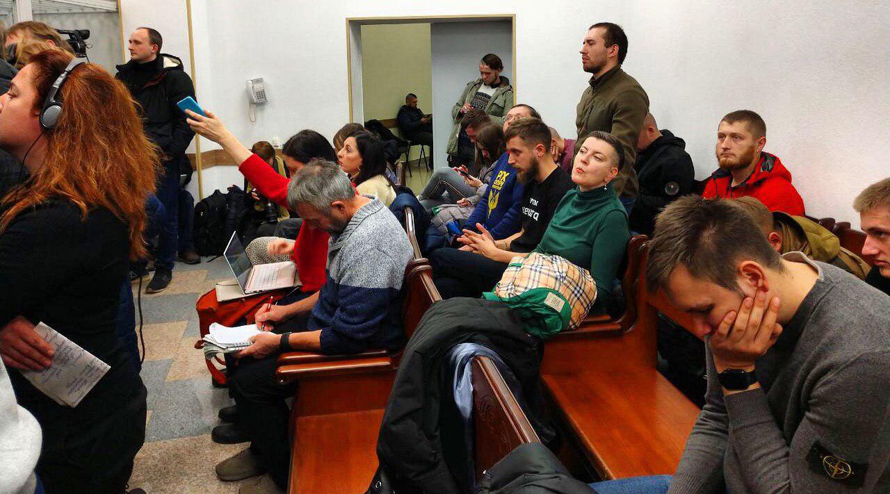 14:20 "На суде присутствует небольшая группа активистов, выступающих против удовлетворении иска. Среди них представители штаба "Рух опору капітуляції" и бывшие члены организации С14" - пишет PavlovskyNews. в частности, на фото есть погромщик с Лысой горы Сергей Мазур из С14.
