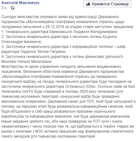 В феврале 2020 года Министерство культуры, молодежи и спорта Украины запустит на базе UA|TV телеканал для населения временно не контролируемых территорий Донбасса.