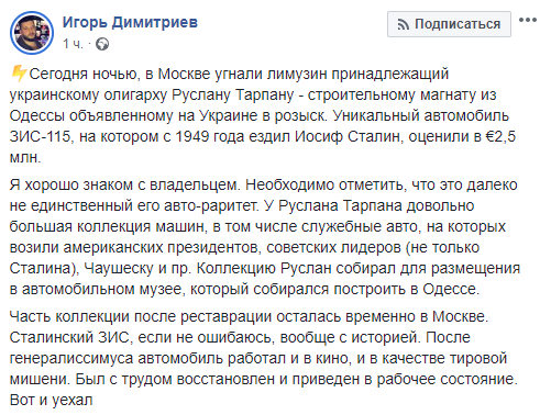 "Уникальный автомобиль ЗИС-115, на котором с 1949 года ездил Иосиф Сталин, оценили в €2,5 млн. Я хорошо знаком с владельцем. Необходимо отметить, что это далеко не единственный его авто-раритет. У Руслана Тарпана довольно большая коллекция машин, в том числе служебные авто, на которых возили американских президентов, советских лидеров (не только Сталина), Чаушеску и пр. Коллекцию Руслан собирал для размещения в автомобильном музее, который собирался построить в Одессе", - написал Дмитриев.