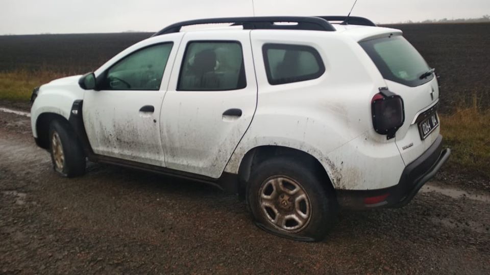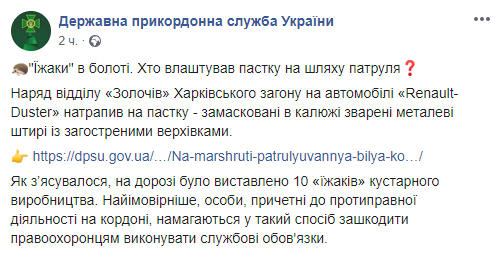 "Вчера около обеда пограничный наряд от отдела "Золочев" Харьковского отряда патрулировал служебным автомобилем "Renault-Duster" вблизи н. п. Басово. За километр от государственной границы автомобиль наткнулся на замаскированные в луже "ежи" - сваренные металлические штыри с заостренными верхушками. Как следствие - два колеса автомобиля были повреждены", - говорится в сообщении.
